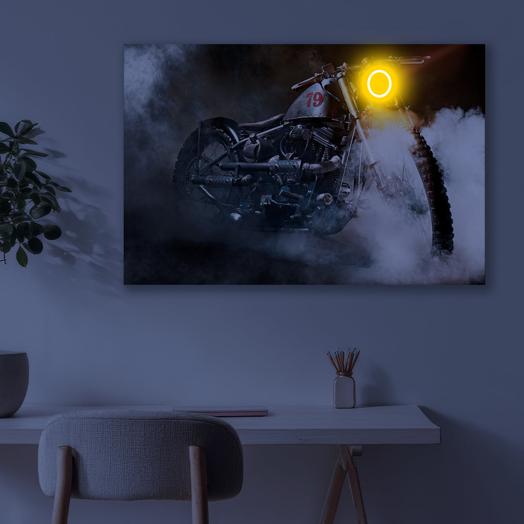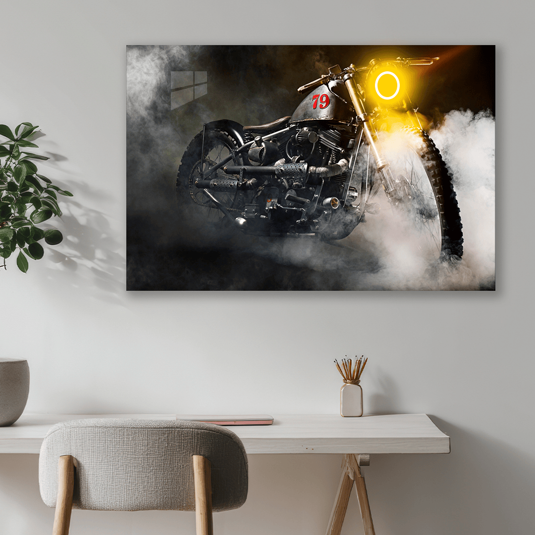 A neon tribute to the ’79 Boneshaker — the bike that didn’t ride roads, it dominated them. Pure old-school chaos glowing on your wall.